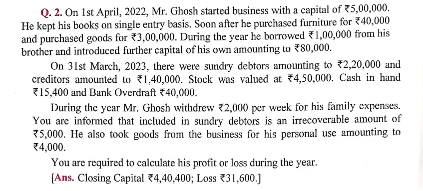 Here is the Solution of Q 2 Accounts from Incomplete Records-Single Entry System DK Goel Class 11 Accountancy 2023-24 for the ISC Board.