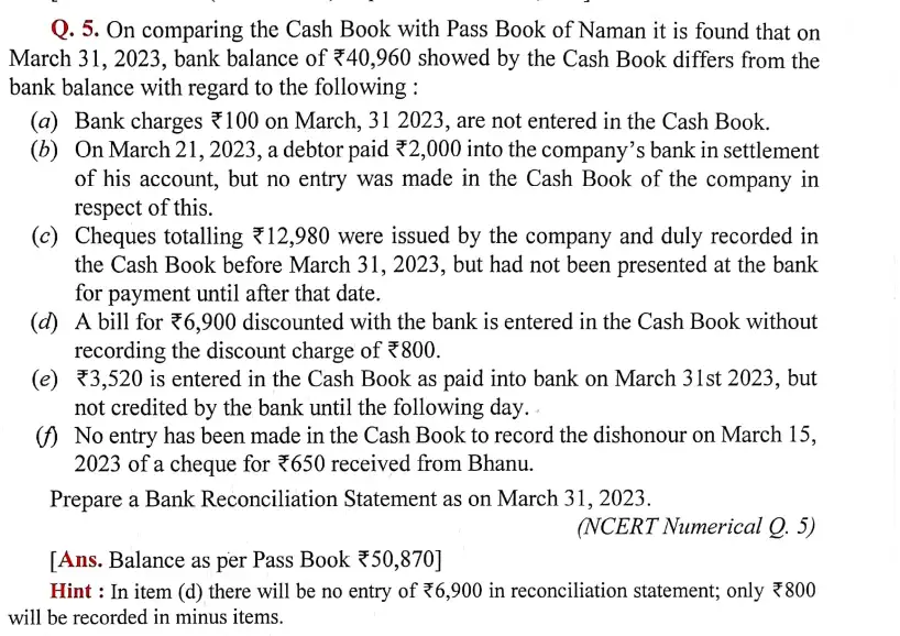 Here is the Solution of Q 5 Bank Reconciliation Statement DK Goel Class 11 Accountancy 2023-24 for the CBSE Board.