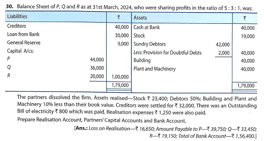 TS Grewal Solution Question 30 Dissolution of Partnership Firm TS Grewal Book CBSE 2024-25 Edition
