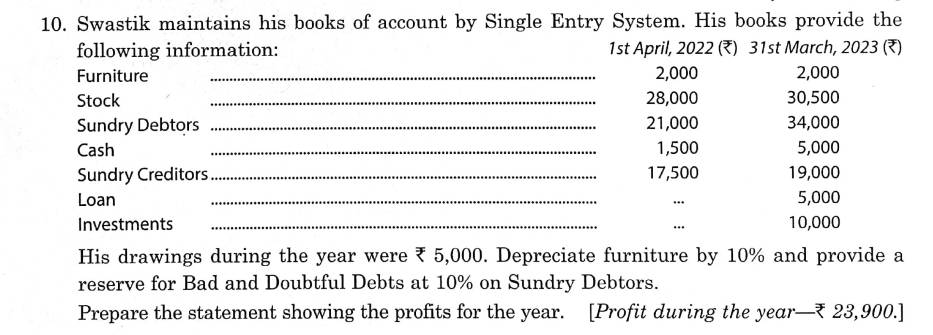 Here is the Solution of Q 10 Accounts from Incomplete Records-Single Entry System TS Grewal Class 11 Accountancy 2023-24 for the CBSE Board.