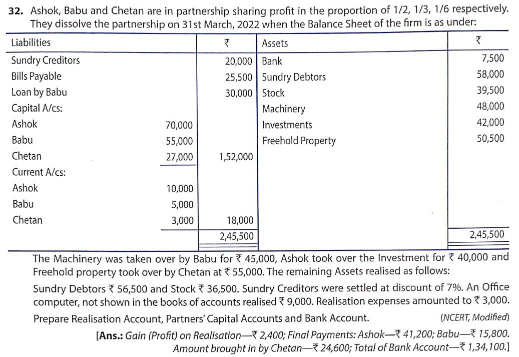 Solution of Q 32 Dissolution of a Partnership Firm TS Grewal 2022-23 [CBSE]