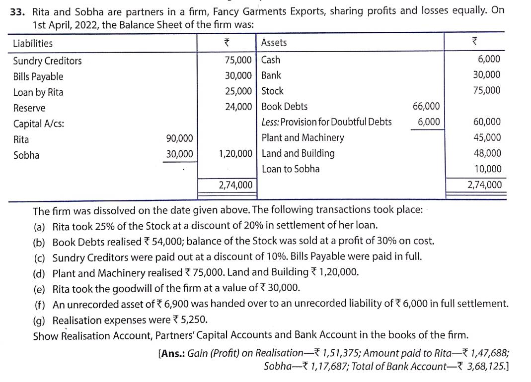 Solution of Q 33 Dissolution of a Partnership Firm TS Grewal 2022-23 [CBSE]