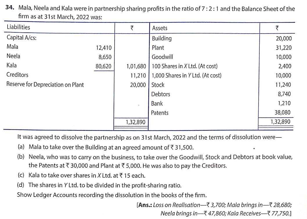 Solution of Question Number 34 Dissolution of a Partnership Firm TS Grewal CBSE 2022-23 Edition