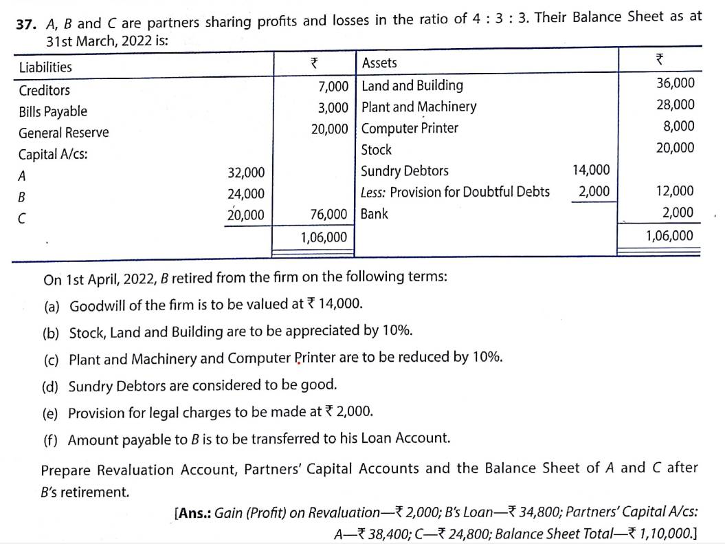 Here is the Solution of Q 37 Retirement of Partner TS Grewal Class 12 Accountancy 2022-23 for the CBSE Board.